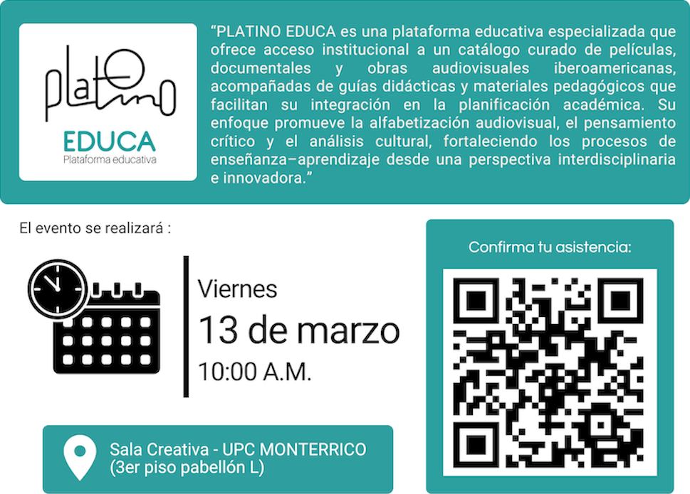 El evento contará con la participación de Jaime Campos (Director General de EGEDA Perú), Octavio Dapena (Gerente de EGEDA y Director de PLATINO EDUCA), la Dra. Cecilia Justino (Directora de Gestión del Conocimiento), la Dra. Úrsula Freundt Thurne Freundt (Decana de la Facultad de Comunicaciones) y el Mag. Alberto Mejía (Director de la Carrera de Comunicación Audiovisual y Medios Interactivos), quienes compartirán con los asistentes sus alcances institucionales y las modalidades de acceso para docentes y estudiantes.