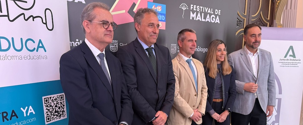 Algunos de los representantes de las instituciones y entidades presentes: Manuel Jesús Sánchez, director general de Ordenación y Evaluación Educativa de la Consejería de Desarrollo Educativo y Formación Profesional de la Junta de Andalucía; Juan Antonio Vigar, director del Festival de Málaga; Manuel Pérez, presidente del Consejo Escolar de Andalucía; y Octavio Dapena, director de Platino EDUCA.